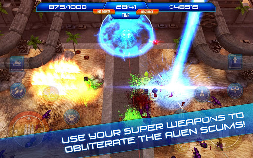Survive multiple waves of alien invaders and blast them away with RAILGUNS and ROCKET LAUNCHERS. Gather enough resources to call down devastating SUPER WEAPONS like PARTICLE CANNON and BOMBARDMENT to obliterate your foes. Enemy grows stronger every minute prepare yourself by collecting power ups on the battlefield.