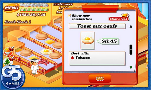 Stand O’ Food is an original, fast-paced restaurant challenge with millions of players. Feed a host of hungry patrons before they leave in a huff! Slap together burgers and cook up some bacon as quickly as you can! But it's not all about speed – you've also got to plan ahead. Put the sandwiches together in the correct sequence, and set yourself up so you can make the next sandwich without difficulty. Earn money to purchase condiments and upgrade your equipment to serve tastier food even faster than before. Stand O' Food will satisfy all of your cravings!• 2 Gameplay modes: Quest and Lunch Rush